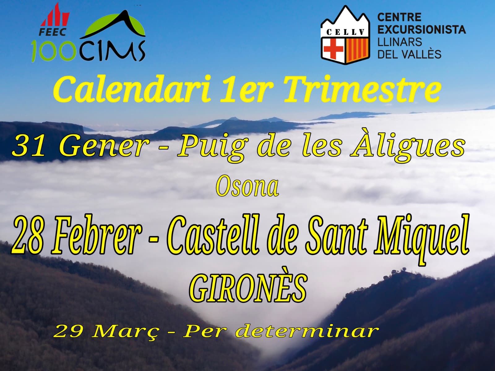 Seguim aquest 2026 amb una nota etapa de la secció! Es tracta del Repte dels 100 cims, que va impulsar la FEEC fa uns anys i que té com a finalitat principal la coneixença del territori català, tot practicant l’excursionisme ( https://www.feec.cat/activitats/100-cims/) . La proposta és fer una sortida mensual en grup a un dels cims que es troben dins del llistat de 308 cims que proposa la FEEC. Si esteu interessats, podeu enviar un correu a 100cimscellv@gmail.com.